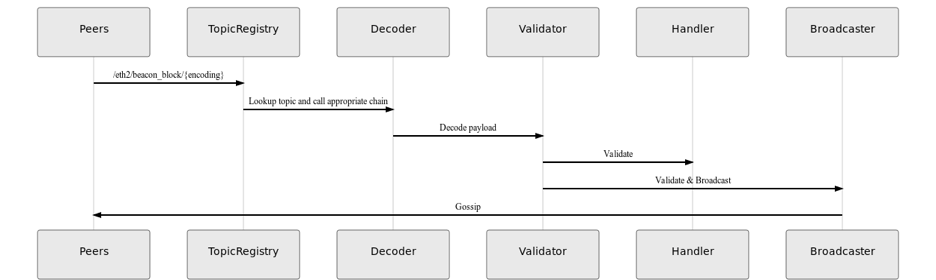 Libp2p’s GossipSub implementation has the concept of topic validators. Registering topic validation would work for the type of validation that we require, however it would also require decoding the same message twice. The trade off is that the topic handler has less responsibility, but at a cost of duplicated efforts.